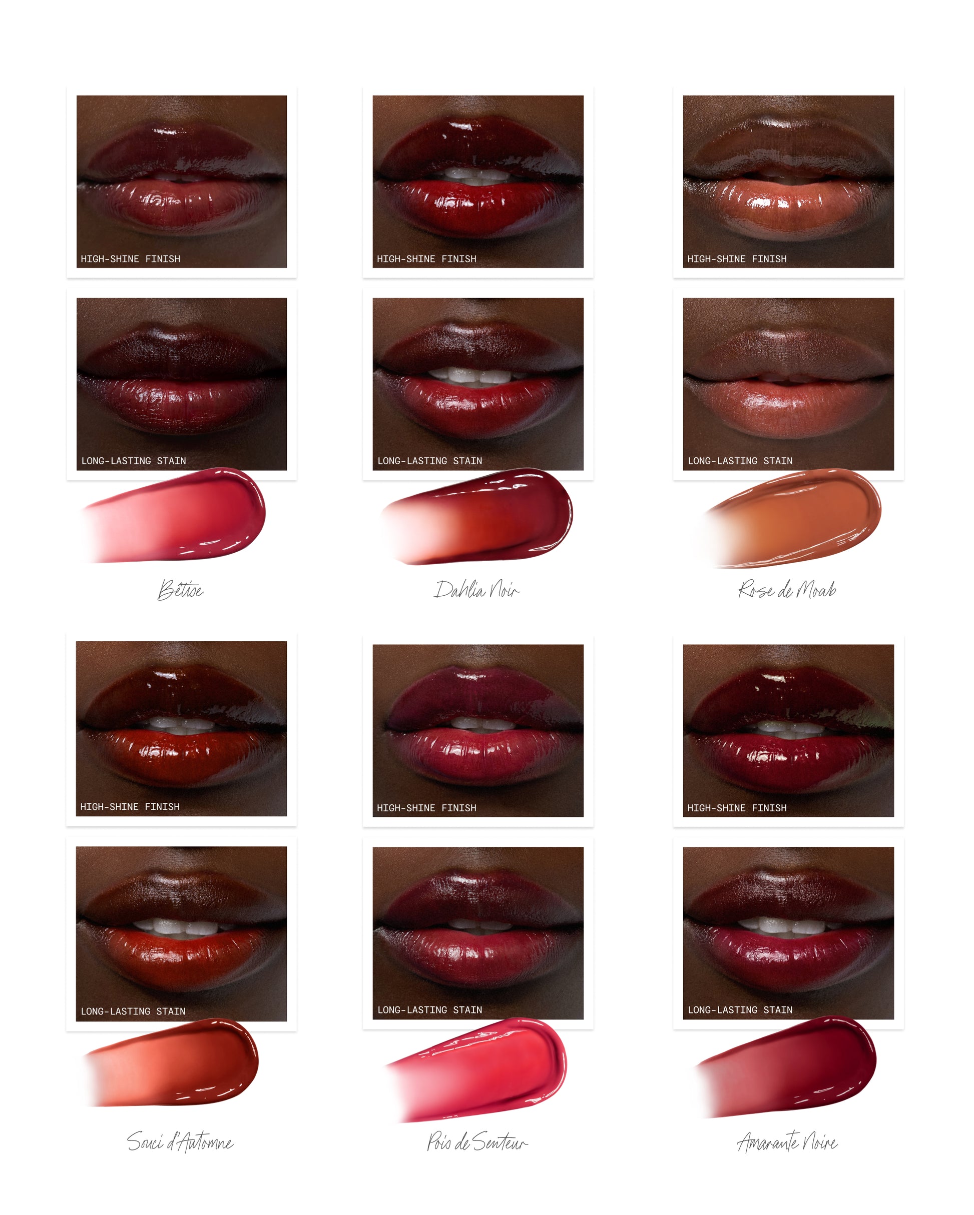 | Finish | High Shine | Hydrating Matte | Natural Shine | Hydrating Matte | Velvety Matte |